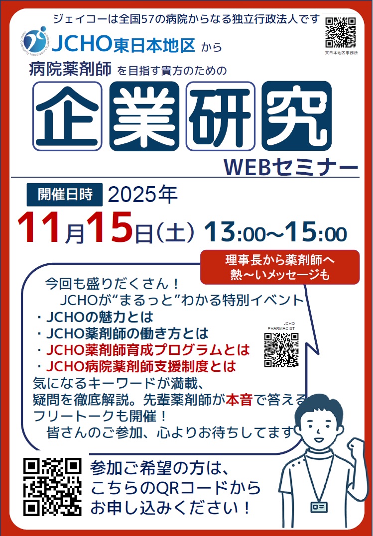 JCHO東日本地区からのお知らせ 薬剤師を目指す貴方のための『企業研究WEBセミナー』を開催します。