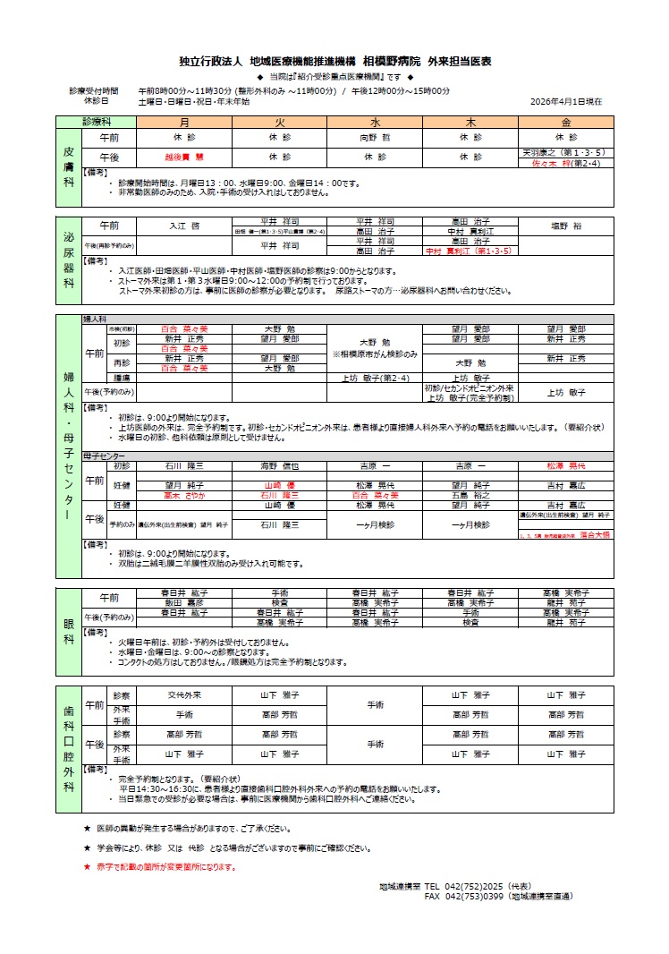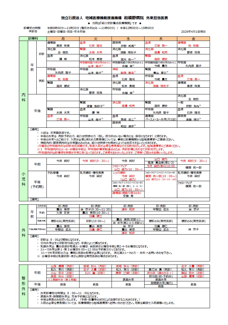 外来診療担当医表